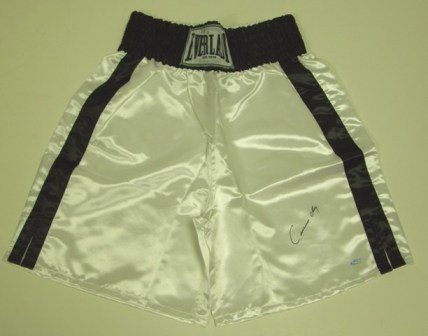 This is a very rare piece of memorabilia. This pair of Everlast boxing trunks has been signed by one of the most recognized and popular athletes of all time. Muhammad Ali has signed these trunks "Cassius Clay". He rarely signs Cassius Clay, therefore making this item even more unique. This was signed at a private signing with Steiner Sports and features a tamper-proof hologram from Steiner Sports as well as a Certificate of Authenticity from Collectibles of the Game.