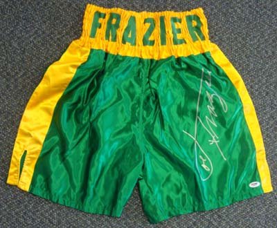 This is a pair of Green & Yellow Everlast Trunks that has been hand signed by Joe Frazier. The autograph has been certified authentic by PSA/DNA and comes with their sticker and matching certificate.