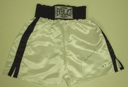 This pair of Everlast boxing trunks has been signed by one of the most recognized and popular athletes of all time. Muhammad Ali has signed these trunks and what makes this pair so unique is that the signature is very large. This was signed at a private signing with Steiner Sports and features a tamper-proof hologram from Steiner Sports as well as a Certificate of Authenticity from Collectibles of the Game.